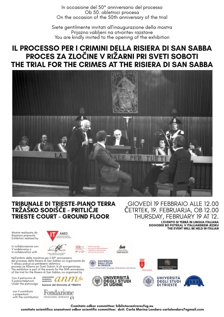 La mostra Il processo per i crimini della Risiera di San Sabba viene inaugurata giovedì 19 febbraio alle ore 12.00 al Palazzo di Giustizia di Trieste, Foro Ulpiano 1.