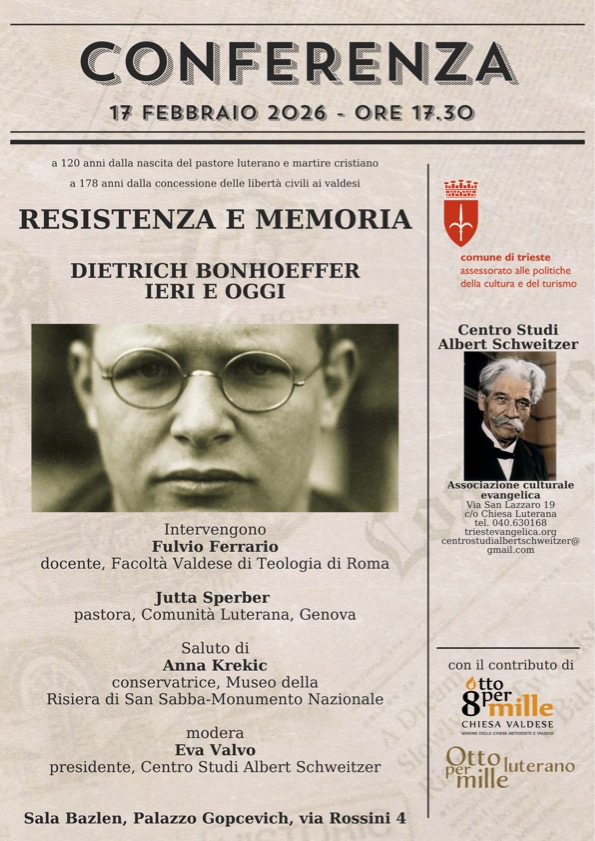 Martedì 17 febbraio 2026 alle ore 17.30 nella Sala Bazlen di Palazzo Gopcevich in via Rossini 4 a Trieste si terrà la conferenza Resistenza e memoria: Dietrich Bonhoeffer ieri e oggi.
