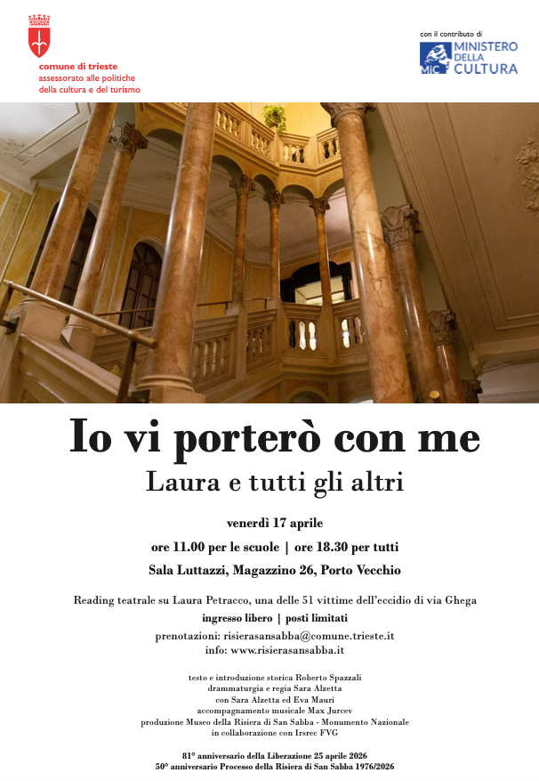 Lo spettacolo, che ha debuttato con successo al Conservatorio Tartini nel 2024 a 80 anni dall’eccidio, è prodotto dal Museo della Risiera di San Sabba – Monumento Nazionale con il contributo del Ministero della Cultura.